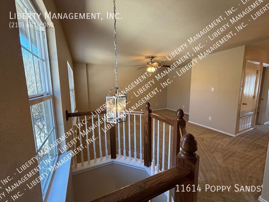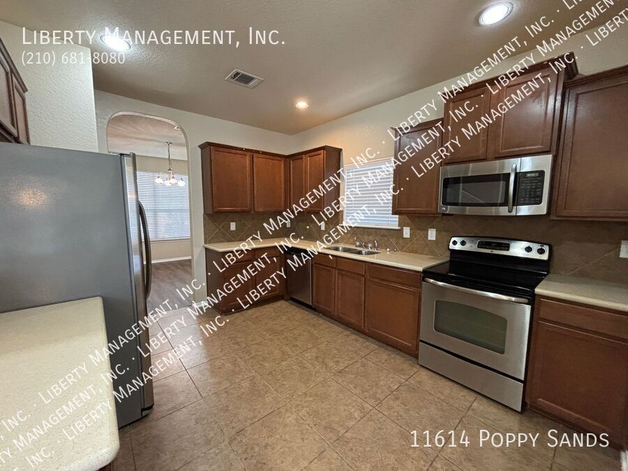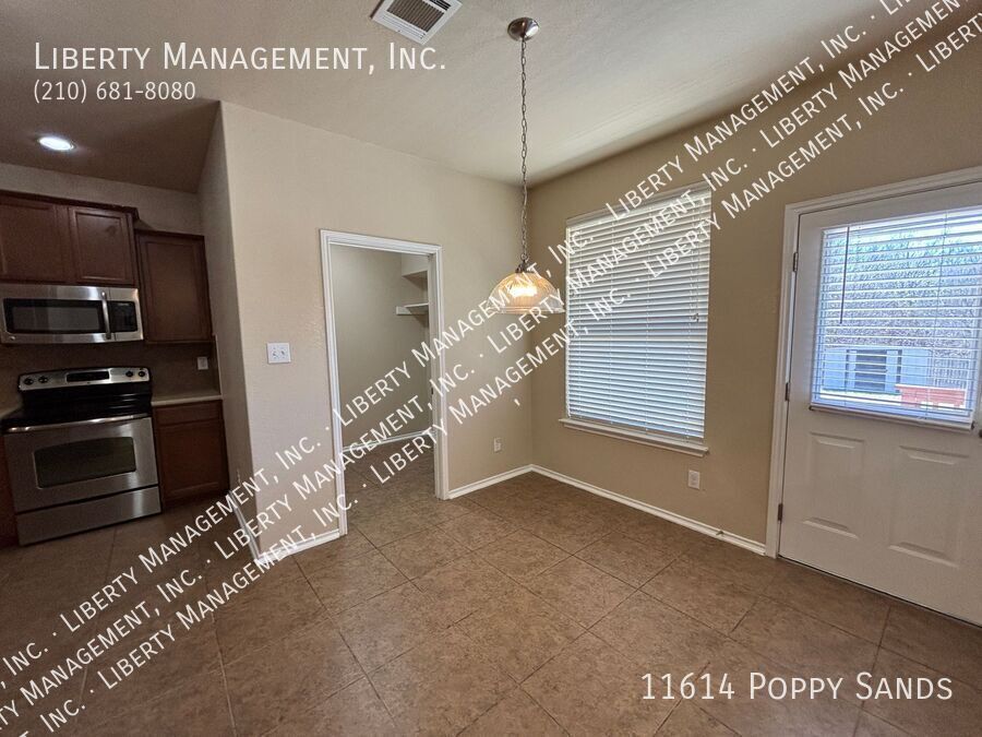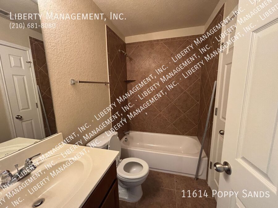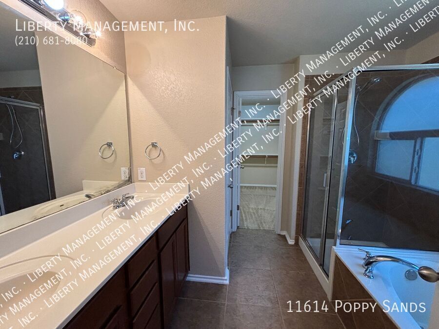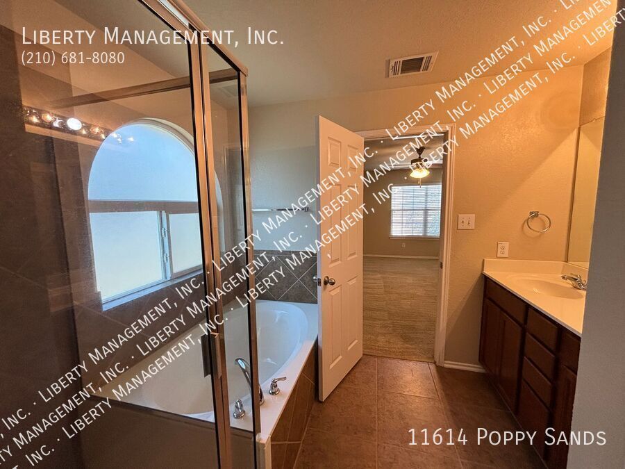 This charming 3-bedroom, 2.5-bath home in the Amhurst community features new flooring in the living room, dining room, and has been freshly painted. Upstairs, you'll find a versatile loft/game room. The kitchen includes a cozy eat-in dining space. The primary suite boasts a walk-in closet and an ensuite bathroom with a double vanity, garden tub, and separate shower. Enjoy outdoor entertaining in the nicely sized yard with a covered patio. Conveniently located near major highways, SeaWorld, shopping, and dining.