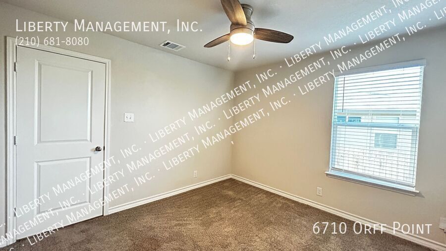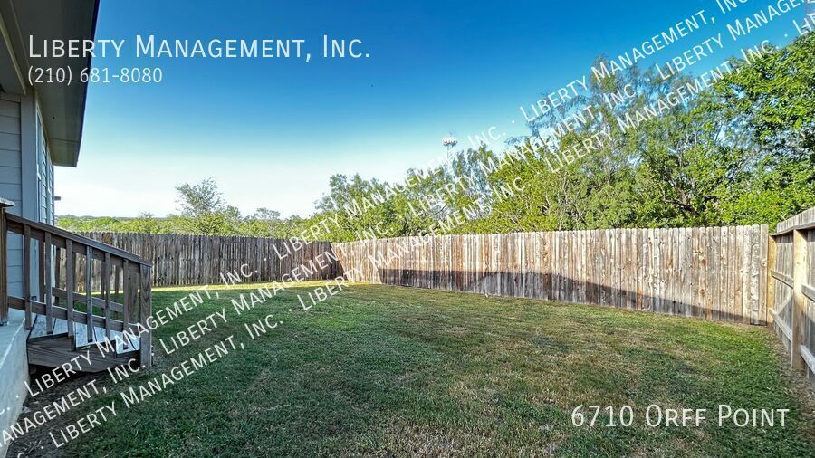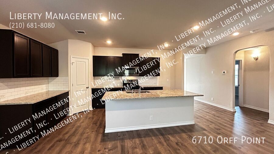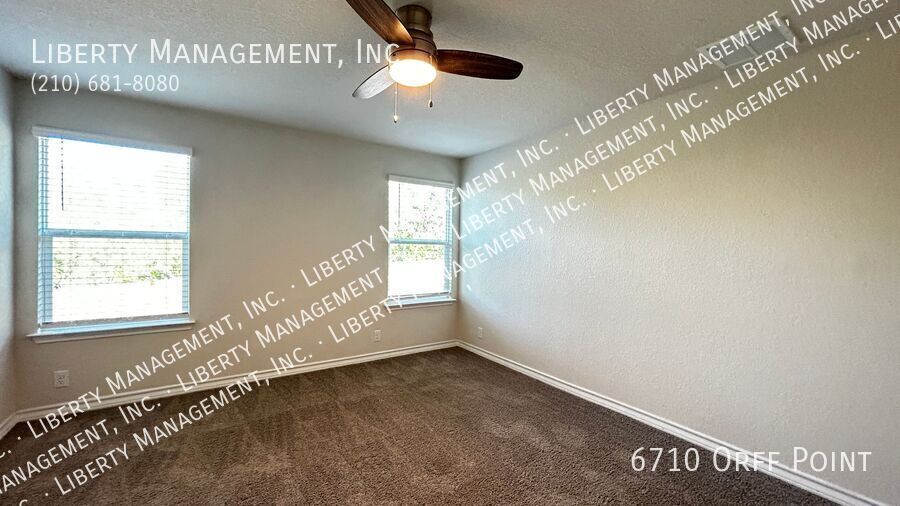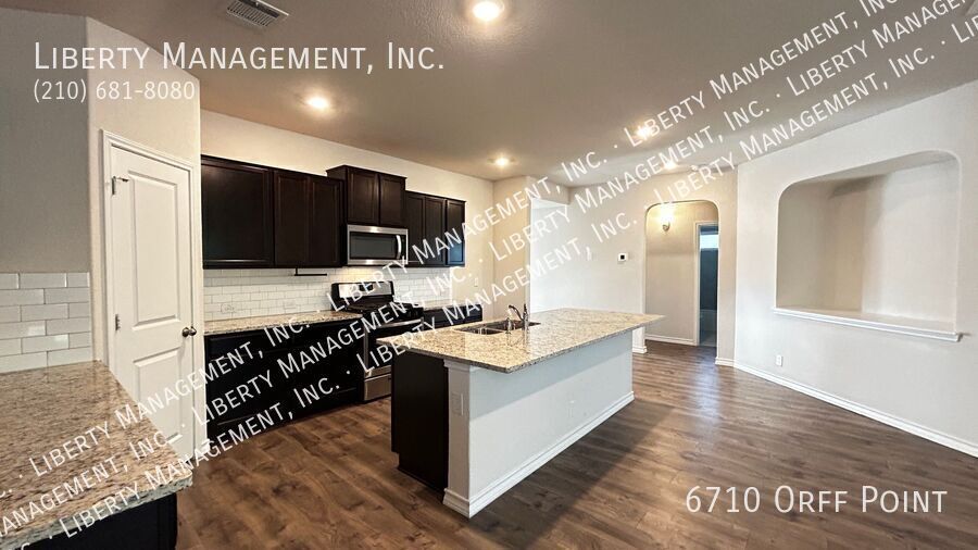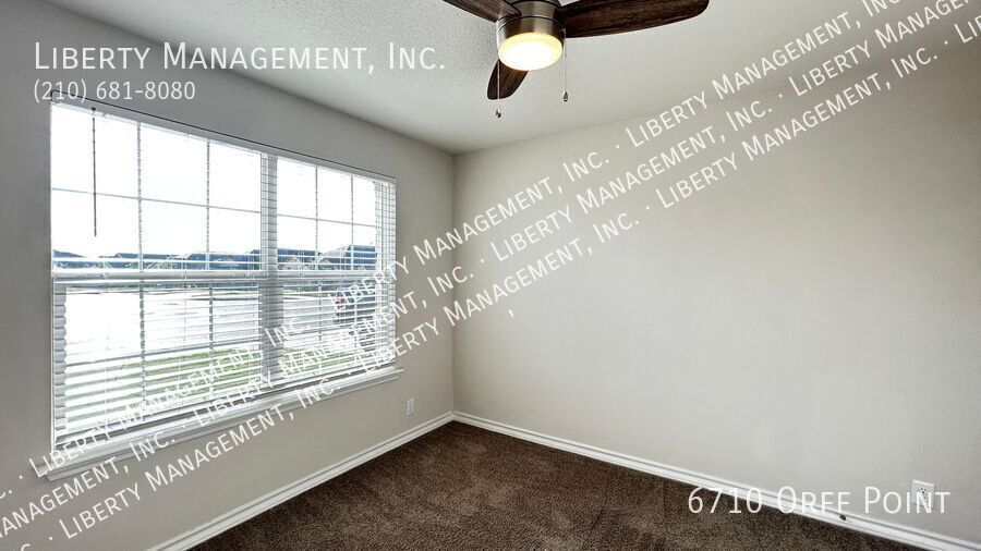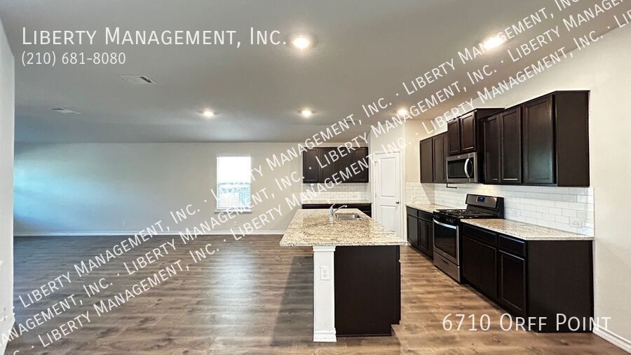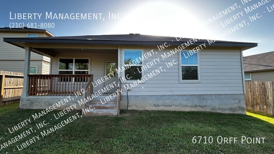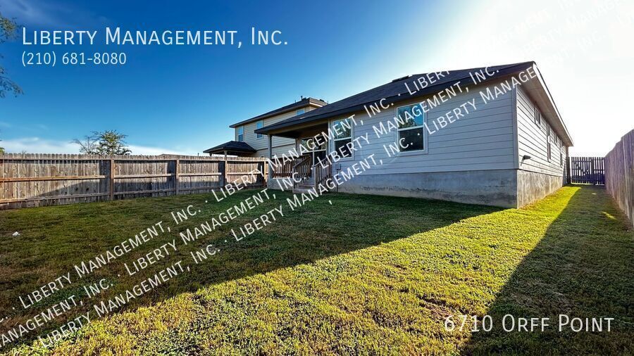 MOVE IN SPECIAL: 1 MONTH FREE* Welcome to your dream rental home near SeaWorld and Lackland Airforce Base! This stunning 4-bedroom, 2-bathroom single story home is located on a greenbelt in the Whisper Falls subdivision, a master planned community conveniently located off Highway 90. Experience the ultimate in resort-style living with amenities such as a pool, clubhouse, cabanas, playground, basketball court, and splash pads for kids. With major shopping and restaurants just a stone's throw away, you'll have everything you need right at your fingertips. The kitchen is an entertainer's delight, boasting ample cabinet space, granite counters, a huge island bar, stainless steel Whirlpool appliances, gas cooking, and LED canned recessed lights. The open floor plan features an oversized island bar overlooking the dining area and living room, making it perfect for hosting family and friends. Relax in the privacy of your spacious primary bedroom retreat, tucked away at the back of the house for ultimate tranquility. Enjoy a separate shower stall and a huge garden tub, a walk-in closet, and dual vanities. Every bedroom and the living room also has a ceiling fan for added comfort. Don't miss out on the chance to make this amazing rental home your own. *Owner will be adding a refrigerator with an approved applicant*