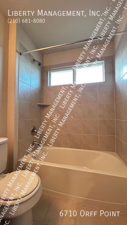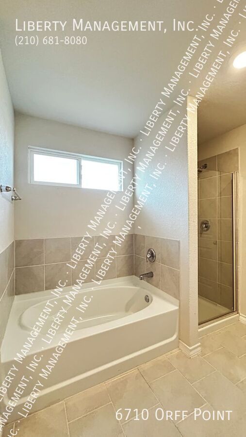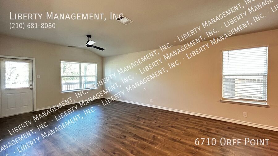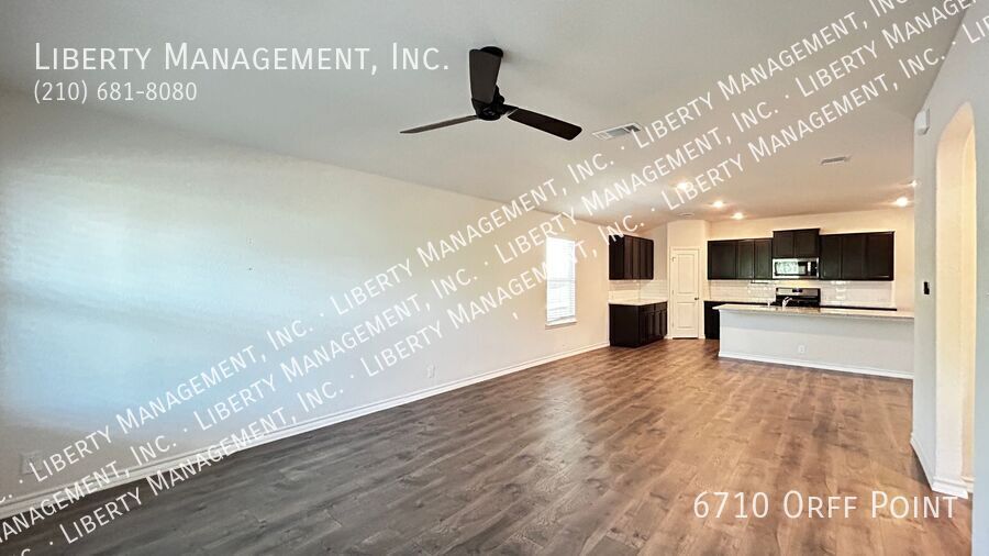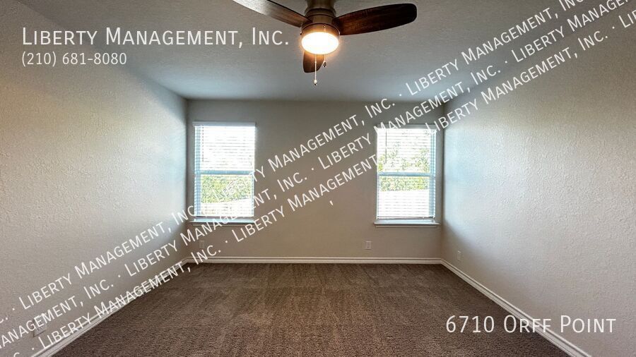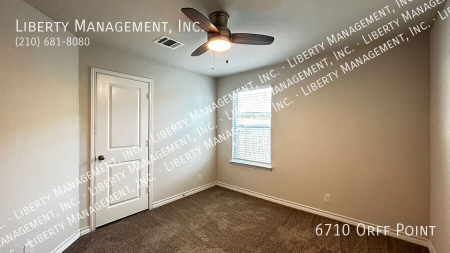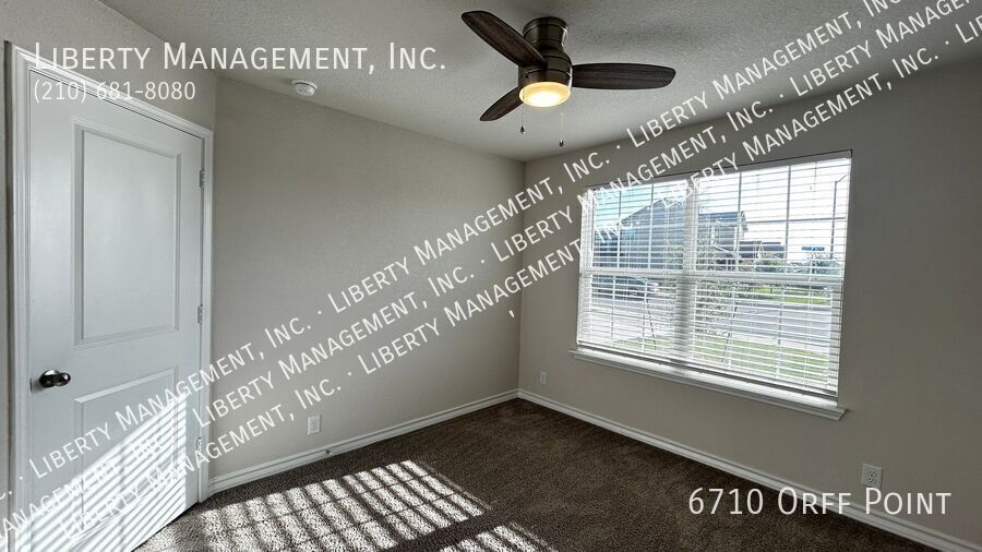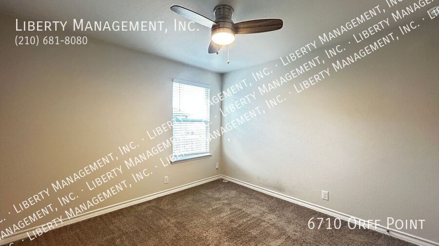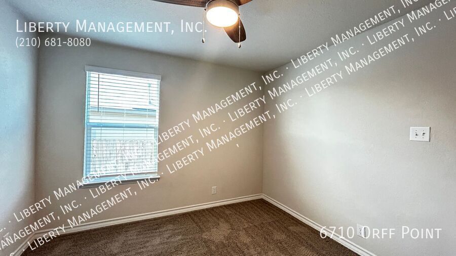 MOVE IN SPECIAL: 1 MONTH FREE* Welcome to your dream rental home near SeaWorld and Lackland Airforce Base! This stunning 4-bedroom, 2-bathroom single story home is located on a greenbelt in the Whisper Falls subdivision, a master planned community conveniently located off Highway 90. Experience the ultimate in resort-style living with amenities such as a pool, clubhouse, cabanas, playground, basketball court, and splash pads for kids. With major shopping and restaurants just a stone's throw away, you'll have everything you need right at your fingertips. The kitchen is an entertainer's delight, boasting ample cabinet space, granite counters, a huge island bar, stainless steel Whirlpool appliances, gas cooking, and LED canned recessed lights. The open floor plan features an oversized island bar overlooking the dining area and living room, making it perfect for hosting family and friends. Relax in the privacy of your spacious primary bedroom retreat, tucked away at the back of the house for ultimate tranquility. Enjoy a separate shower stall and a huge garden tub, a walk-in closet, and dual vanities. Every bedroom and the living room also has a ceiling fan for added comfort. Don't miss out on the chance to make this amazing rental home your own. *Owner will be adding a refrigerator with an approved applicant*