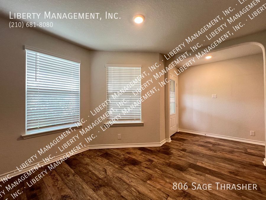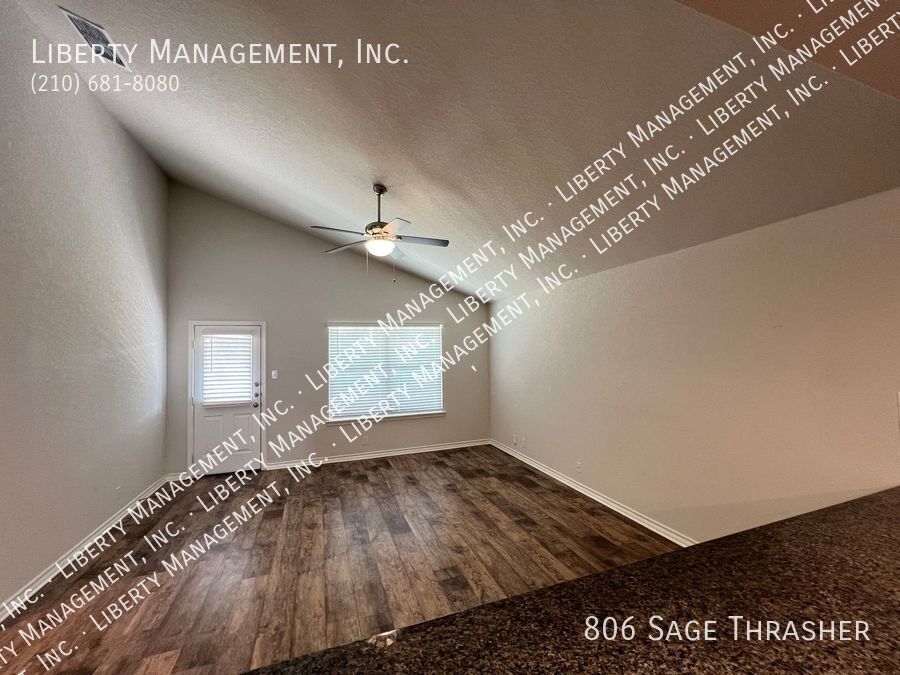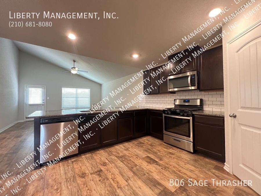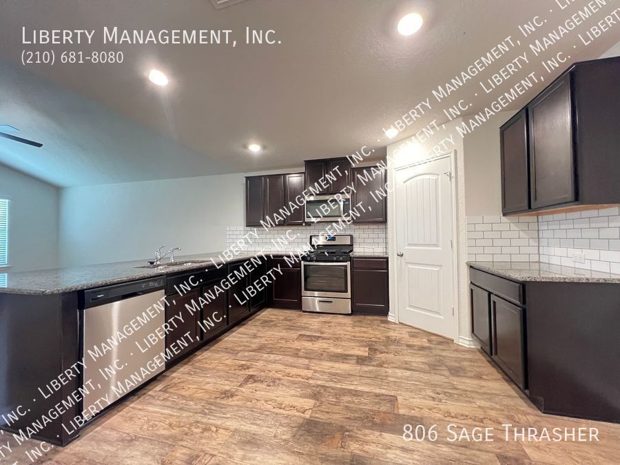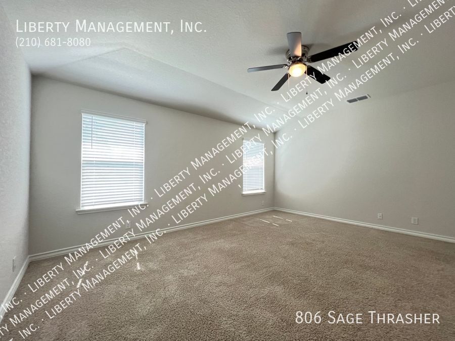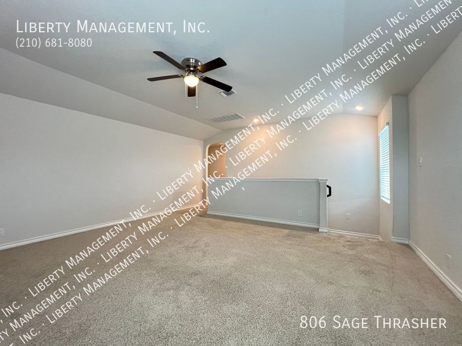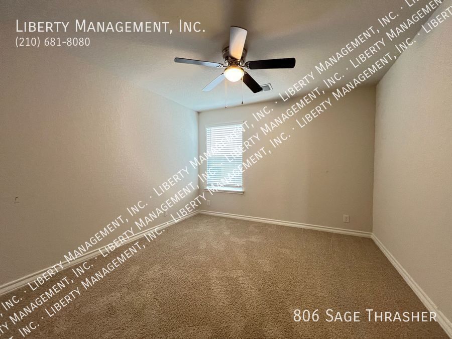 Beautiful 4 Bedroom, 2.5 Bath Home on a Greenbelt featuring a formal dining, and a huge game room upstairs. This gem's floor plan offers an inviting entry way that leads to formal dining room and kitchen with island bar, stainless steel kitchen appliances, granite counters, recessed lights, plenty of cabinet space, & eat-in area. Home has neutral colors, blinds, and ceiling fans throughout. Primary comes come with ceiling fan, walk in closet, separate tub/shower stall , & dual vanity. This home's deck & good-sized backyard is an entertainer's delight. Quick access to 90 & 211. Just minutes to Lackland AFB, SeaWorld, shopping, and restaurants.