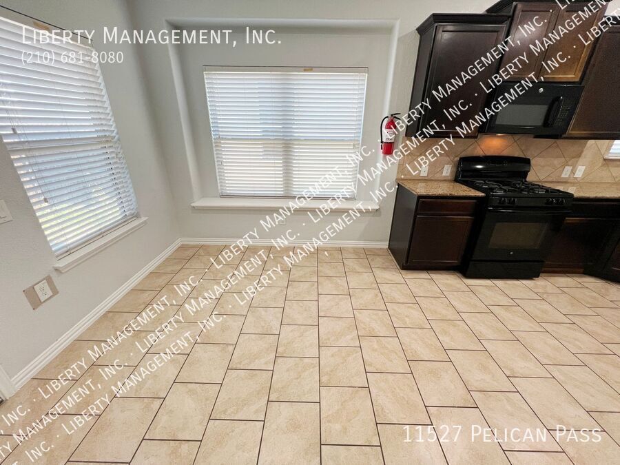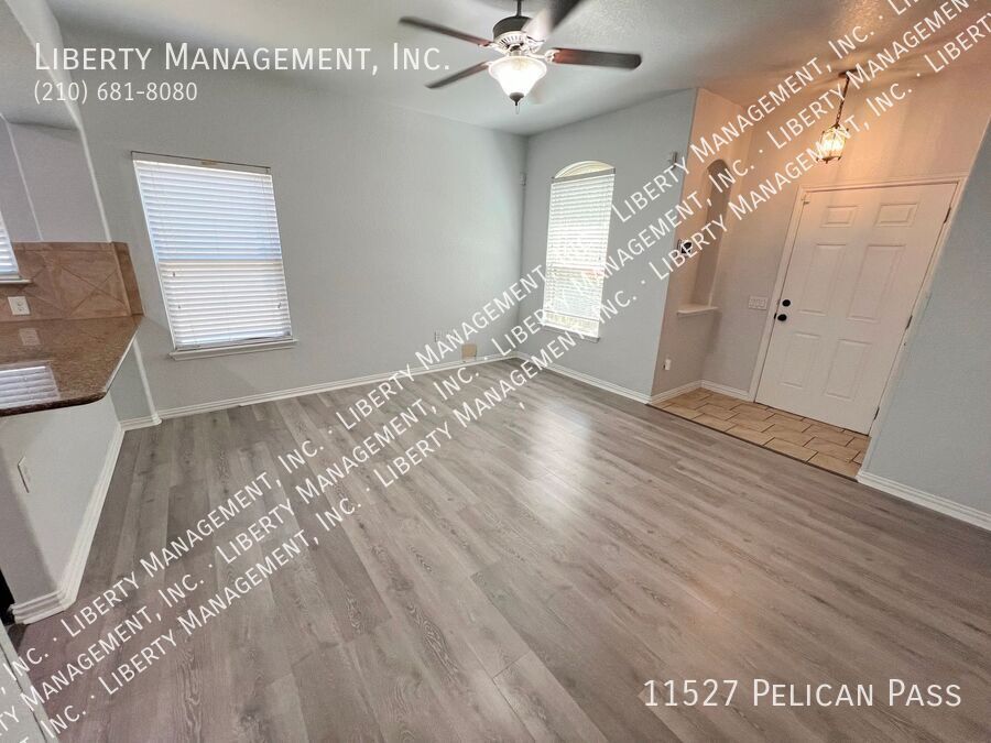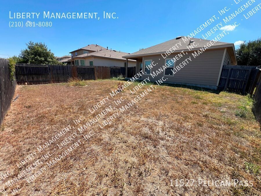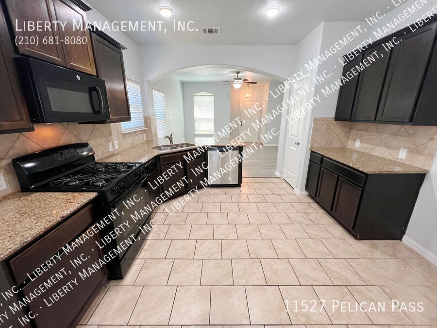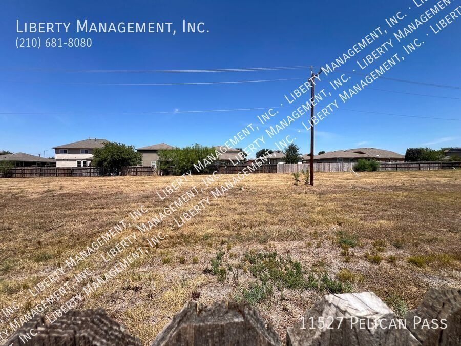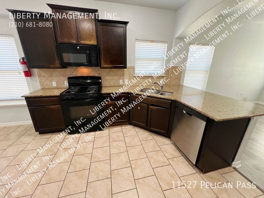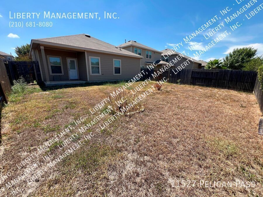 3 Bed 2 Bath 1309 sq ft Single Story Home on a Greenbelt. All Luxury Vinyl Plank and Tile floors, No Carpets! Living Room with Ceiling Fan. Kitchen with Granite counters, Breakfast Bar, Gas Stove, Microwave and Dishwasher. Primary Bedroom w/ Ceiling Fan, Walk-in Closet. Primary Bath with separate Shower/Garden Tub, Dual Sinks. 2 Car Garage, Gas Water heater. Fenced Yard with Covered Patio. Just minutes to 410, Brook City-Base, Lackland AFB! Community Pool and Playground. Elementary School in the subdivision.