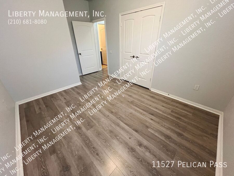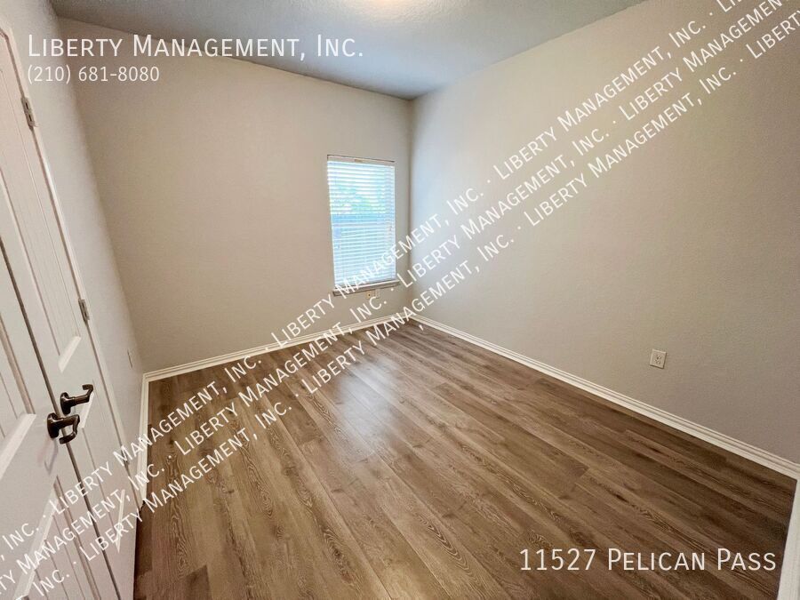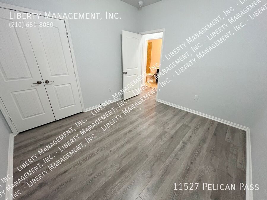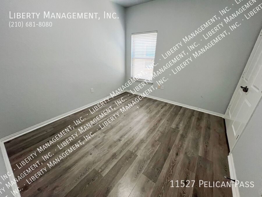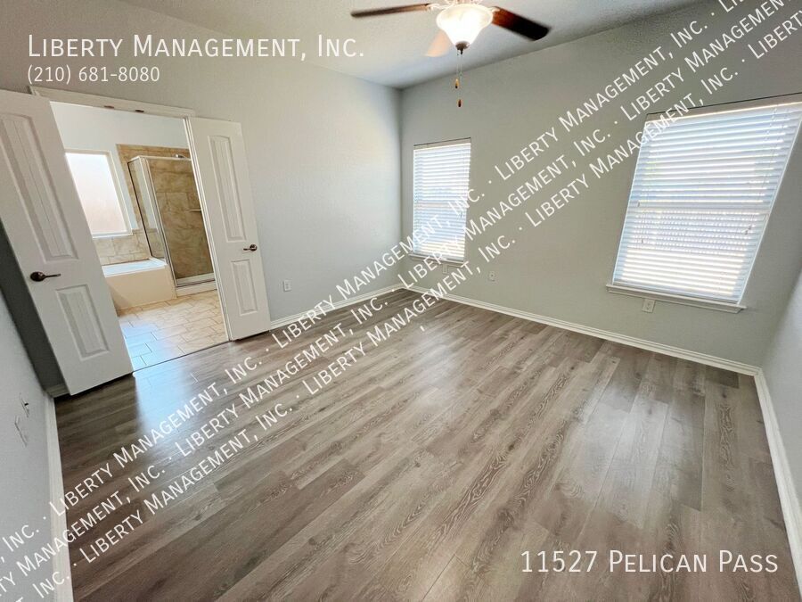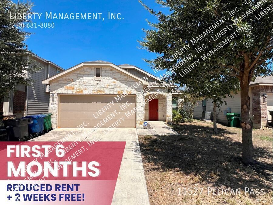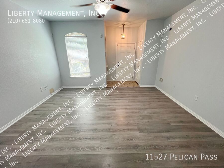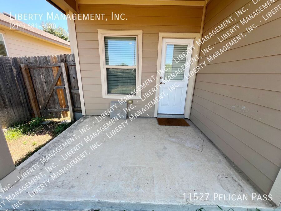 3 Bed 2 Bath 1309 sq ft Single Story Home on a Greenbelt. All Luxury Vinyl Plank and Tile floors, No Carpets! Living Room with Ceiling Fan. Kitchen with Granite counters, Breakfast Bar, Gas Stove, Microwave and Dishwasher. Primary Bedroom w/ Ceiling Fan, Walk-in Closet. Primary Bath with separate Shower/Garden Tub, Dual Sinks. 2 Car Garage, Gas Water heater. Fenced Yard with Covered Patio. Just minutes to 410, Brook City-Base, Lackland AFB! Community Pool and Playground. Elementary School in the subdivision.